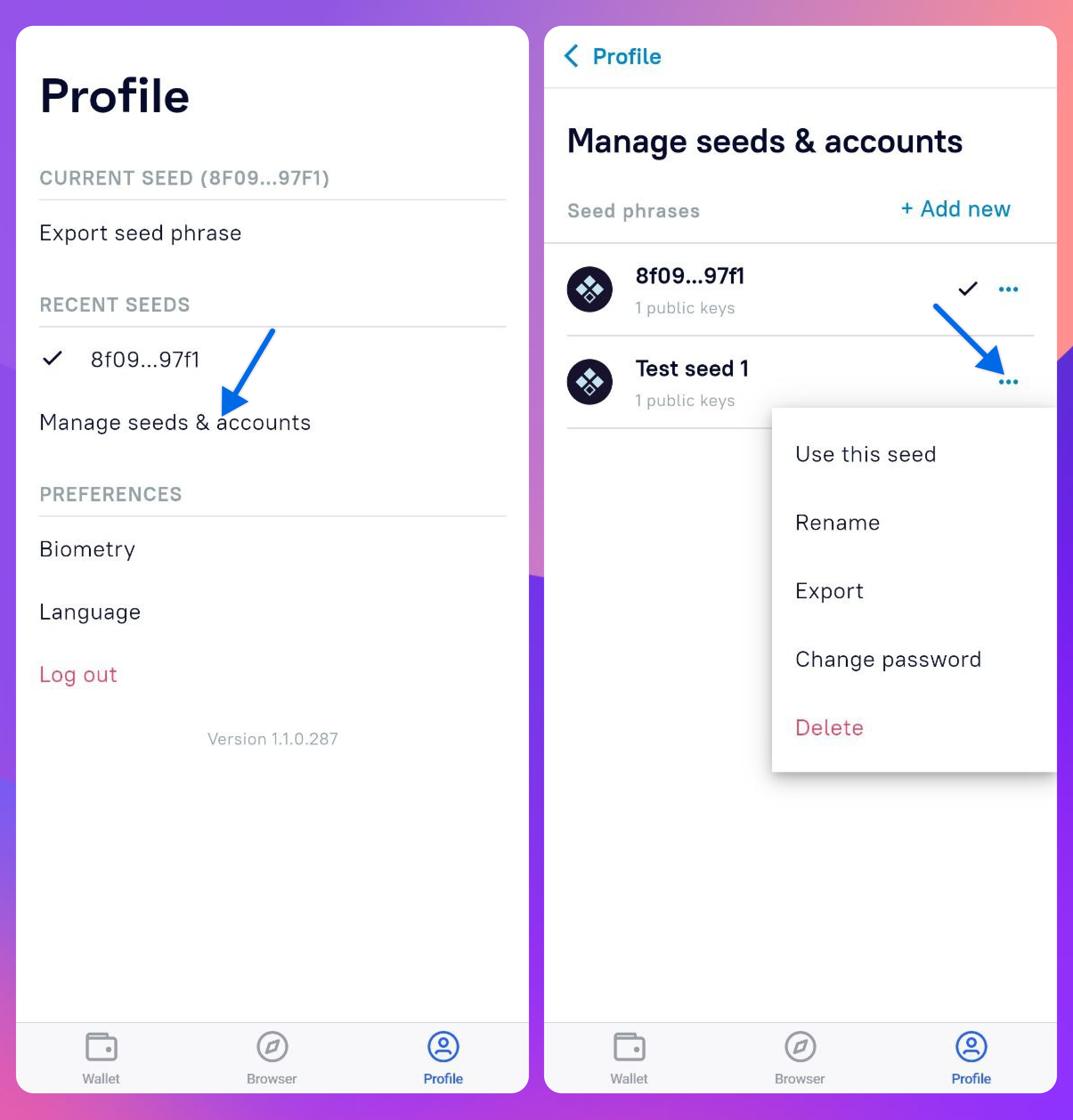 Now you can [switch ](#manage-seed-phrase)between active`seeds`as well as [manage ](#manage-seed-phrase)them.